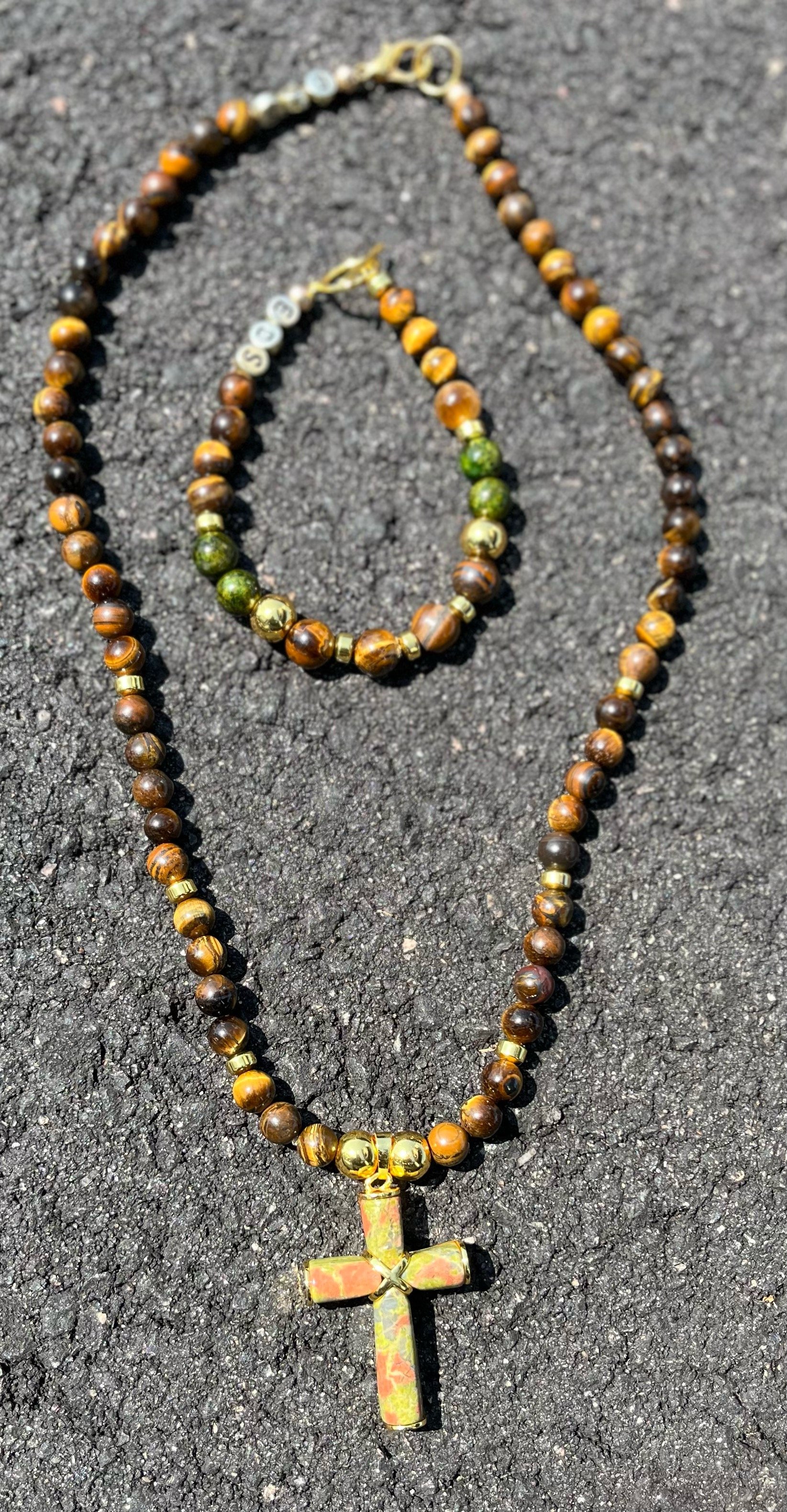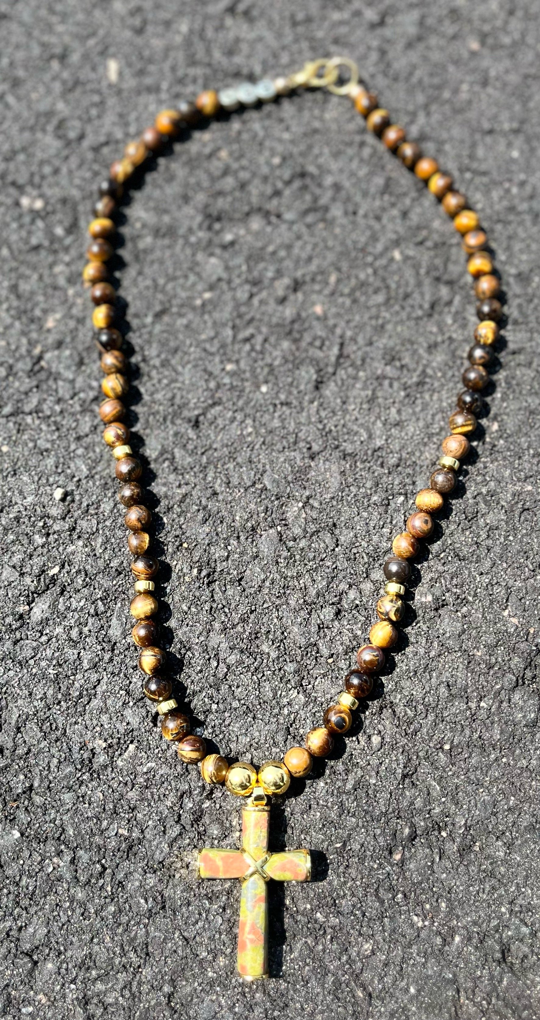 Elevate your ensemble with the Cross of Aurora Necklace, a bespoke masterpiece adorned with gold and tiger eye beads. Personalize with custom initials for added flair, showcasing your unique style with every wear. Crafted to perfection, this necklace radiates elegance and sophistication, making it a must-have accessory for those who appreciate fine craftsmanship and individuality.